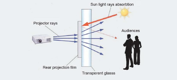 الآن يمكنك تحويل أي مسطح زجاجي شفاف بواسطة فيلم الإسقاط الخلفي إلى شاشة عرض إعلانية فائقة الجودة باستخدام بروجكتور خلفي من داخل مكانك للعرض على المشاهدين من الجهة الأخرى